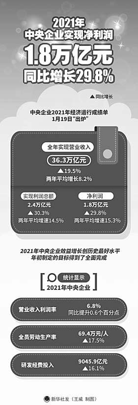 數(shù)據(jù)顯示,2021年,中央企業(yè)實現(xiàn)營業(yè)收入36.3萬億元,同比增長19.5%;實現(xiàn)利潤總額2.4萬億元,同比增長30.3%;實現(xiàn)凈利潤1.8萬億元,同比增長29.8%,均創(chuàng)歷史最好水平。中央企業(yè)全員勞動生產(chǎn)率人均達(dá)到69.4萬元,同比增長17.5%;百元營業(yè)收入支付的成本費用為94元,同比下降0.9元;年末資產(chǎn)負(fù)債率為64.9%,圓滿完成控制在65%以下的目標(biāo)。