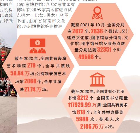 近年來,各地結(jié)合決勝脫貧攻堅、推動鄉(xiāng)村振興和新時代文明實踐中心建設(shè),加快完善基層公共文化設(shè)施網(wǎng)絡(luò),特別是一些中西部省份,在歷史欠賬較多、經(jīng)濟下行壓力大的情況下,拿出真金白銀推進改革。截至2020年年底,全國已建成村、社區(qū)綜合性文化服務(wù)中心57萬多個,基本實現(xiàn)全覆蓋。