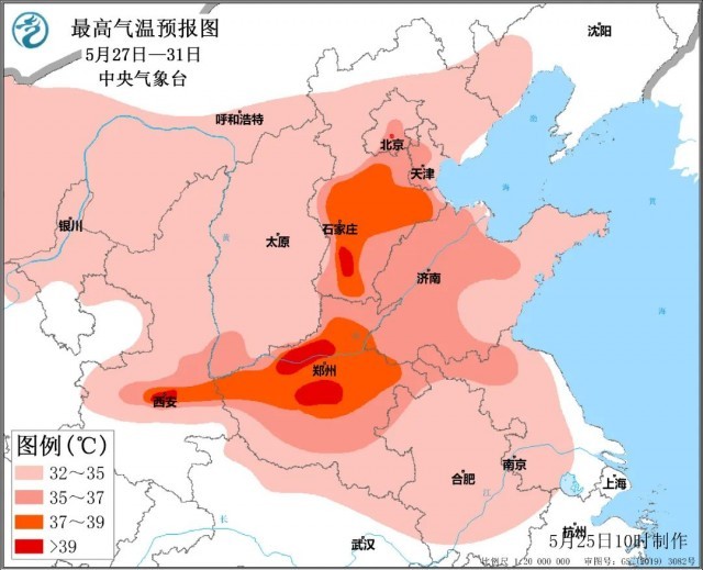 5月27日至31日,西北地區(qū)東部、華北、黃淮、江淮等地將有一次高溫天氣過程,其中,京津冀地區(qū)、河南、山東中西部、蘇皖北部、陜西關中等地最高氣溫在35℃以上,河北南部、河南中西部、陜西關中等地超過37℃,局地可達39~40℃。