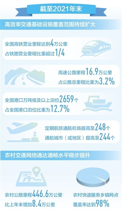 高效率交通基礎(chǔ)設(shè)施覆蓋范圍持續(xù)擴(kuò)大。截至2021年末,全國高鐵營業(yè)里程達(dá)到4萬公里,占鐵路營業(yè)里程比重超過1/4。高速公路里程16.9萬公里,比上年末增加8090公里,占公路總里程比重為3.2%,呈現(xiàn)穩(wěn)步提高態(tài)勢。全國港口萬噸級(jí)及以上泊位2659個(gè)、增加67個(gè),占全國港口泊位比重為12.7%、提高1個(gè)百分點(diǎn)。定期航班通航機(jī)場、通航城市(或地區(qū))分別提高至248個(gè)和244個(gè)。