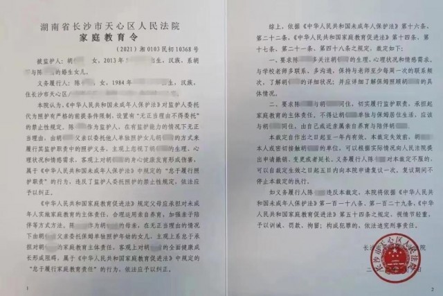 長沙市天心區(qū)人民法院發(fā)出的家庭教育令。
