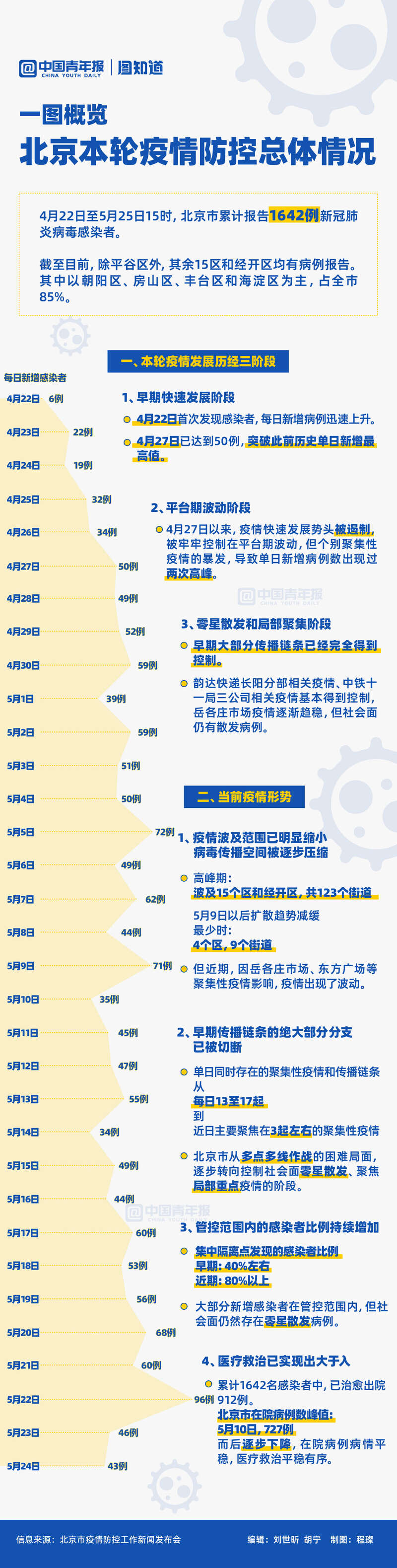 4月22日至5月25日15時,北京市累計報告1642例新冠肺炎病毒感染者,除平谷區(qū)外全市各區(qū)均出現(xiàn)了病例。超大城市迎戰(zhàn)奧密克戎,難之又難的以快制快之戰(zhàn)打得怎么樣、當前北京疫情形勢如何?一圖回顧。