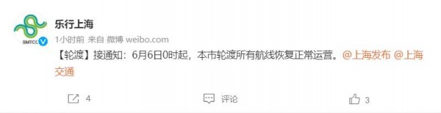 據(jù)上海市交通委員會交通指揮中心官方微博@樂行上海 消息,接通知:6月6日0時起,本市輪渡所有航線恢復(fù)正常運(yùn)營。