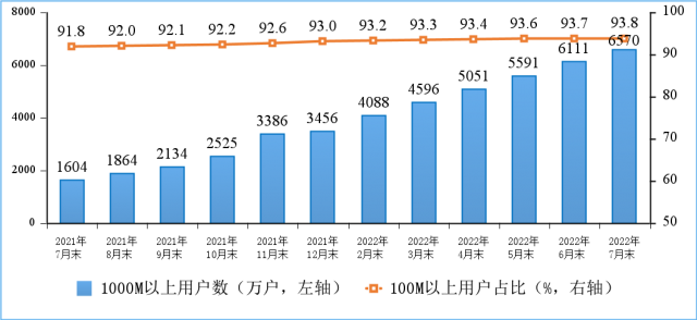 固定寬帶接入用戶規(guī)模穩(wěn)步增長(zhǎng),千兆用戶數(shù)持續(xù)擴(kuò)大。截至7月末,三家基礎(chǔ)電信企業(yè)的固定互聯(lián)網(wǎng)寬帶接入用戶總數(shù)達(dá)5.66億戶,比上年末凈增3070萬(wàn)戶。其中,100Mbps及以上接入速率的固定互聯(lián)網(wǎng)寬帶接入用戶達(dá)5.31億戶,占總用戶數(shù)的93.8%,占比較上年末提升0.8個(gè)百分點(diǎn);1000Mbps及以上接入速率的固定互聯(lián)網(wǎng)寬帶接入用戶達(dá)6570萬(wàn)戶,比上年末凈增3112萬(wàn)戶,占總用戶數(shù)的11.6%。