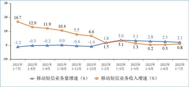 移動(dòng)電話通話量小幅增長(zhǎng),移動(dòng)短信業(yè)務(wù)收入增速回升。1—7月份,移動(dòng)電話去話通話時(shí)長(zhǎng)完成1.32萬(wàn)億分鐘,同比增長(zhǎng)1.1%;固定電話主叫通話時(shí)長(zhǎng)完成483.5億分鐘,同比下降11.8%。1—7月份,全國(guó)移動(dòng)短信業(yè)務(wù)量同比增長(zhǎng)2.1%,移動(dòng)短信業(yè)務(wù)收入同比增長(zhǎng)0.8%,增速較上半年分別回落0.4個(gè)和提升0.5個(gè)百分點(diǎn)。
