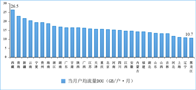 中部地區(qū)移動(dòng)互聯(lián)網(wǎng)接入流量增速領(lǐng)先,西部部分省份DOU值居全國(guó)前列。1—7月份,東、中、西部和東北地區(qū)移動(dòng)互聯(lián)網(wǎng)接入流量分別達(dá)到622.1億GB、330.6億GB、434.6億GB和75.5億GB,同比增長(zhǎng)19.1%、20.5%、19.4%和12.5%。西藏、青海、新疆和云南4省7月當(dāng)月戶均移動(dòng)互聯(lián)網(wǎng)接入流量(DOU)超過20GB/戶·月;各省DOU值最高值與最低值之差為15.8GB/戶·月,差值較去年同期擴(kuò)大2.4GB/戶·月。