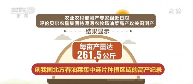 央視網消息:記者從內蒙古自治區(qū)農牧廳獲悉,農業(yè)農村部測產專家組近日對呼倫貝爾農墾集團特泥河農牧場油菜高產攻關田測產的結果顯示,每畝產量達261.5公斤,創(chuàng)我國北方春油菜集中連片種植區(qū)域的高產紀錄。