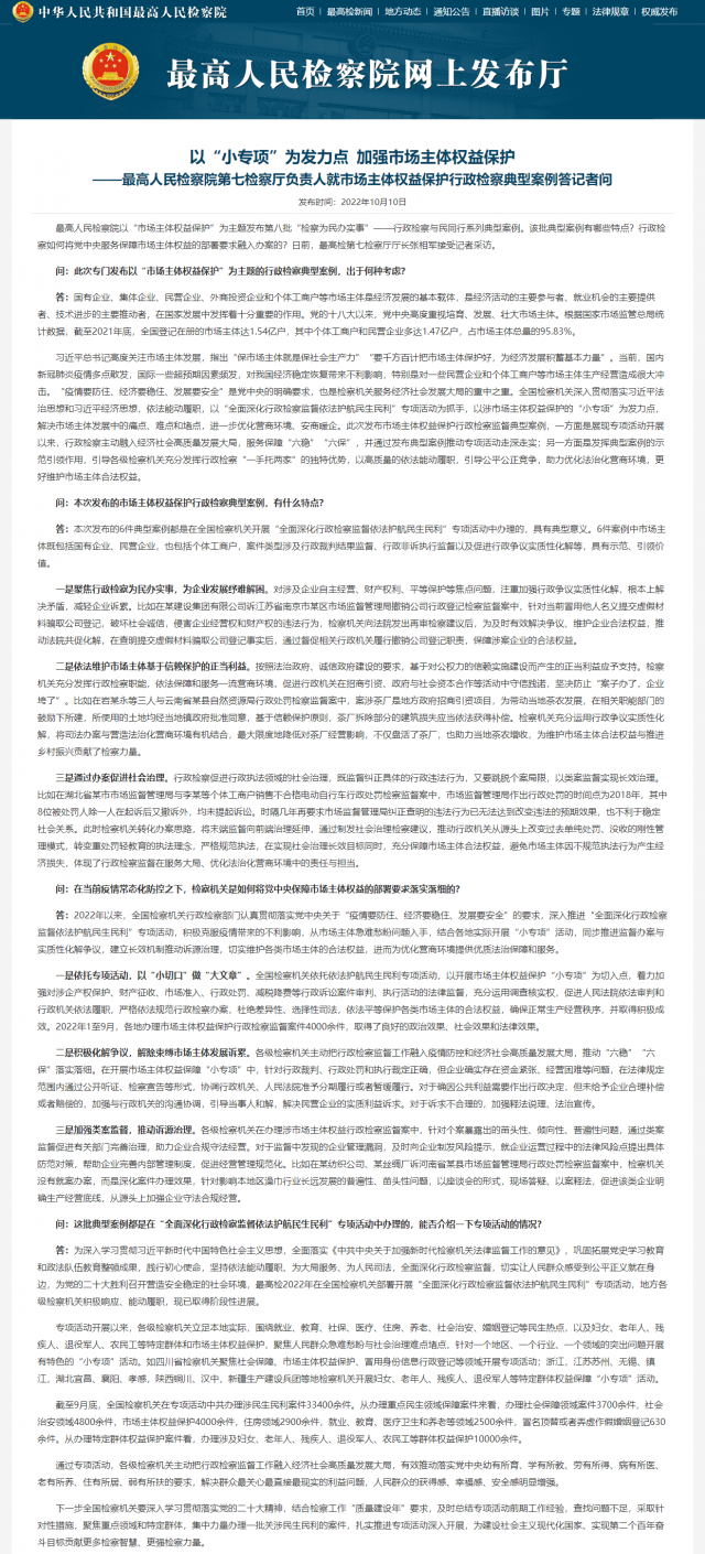 央視網(wǎng)消息:據(jù)中華人民共和國最高人民檢察院網(wǎng)站消息,10月10日,最高人民檢察院以“市場主體權益保護”為主題發(fā)布第八批“檢察為民辦實事”——行政檢察與民同行系列典型案例。