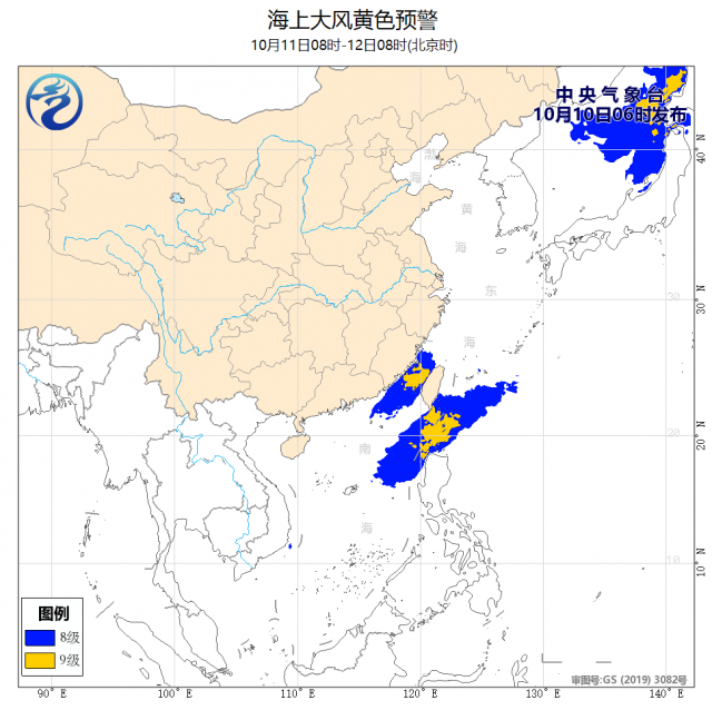 中央氣象臺10月10日06時繼續(xù)發(fā)布海上大風黃色預警:
