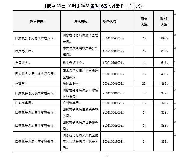 截至10月25日16時,2023國考報名首日的“人氣之星”是國家稅務(wù)總局青海省稅務(wù)局曲麻萊縣稅務(wù)局這一職位,僅招錄1人,已有848人提交報名申請,報名首日競爭比已高達(dá)848:1。