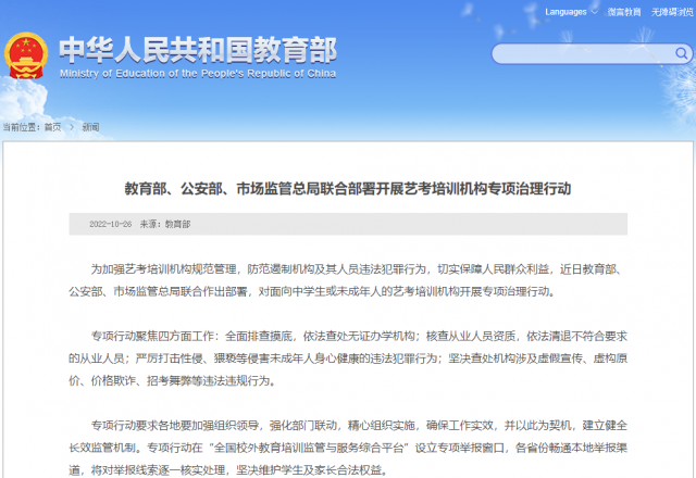 據(jù)教育部網(wǎng)站消息,為加強(qiáng)藝考培訓(xùn)機(jī)構(gòu)規(guī)范管理,防范遏制機(jī)構(gòu)及其人員違法犯罪行為,切實(shí)保障人民群眾利益,近日教育部、公安部、市場(chǎng)監(jiān)管總局聯(lián)合作出部署,對(duì)面向中學(xué)生或未成年人的藝考培訓(xùn)機(jī)構(gòu)開展專項(xiàng)治理行動(dòng)。