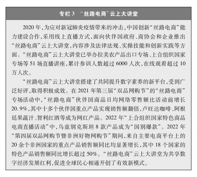 “絲路電商”合作成果豐碩。自2016年以來(lái),中國(guó)與五大洲23個(gè)國(guó)家建立雙邊電子商務(wù)合作機(jī)制,建立中國(guó)-中東歐國(guó)家、中國(guó)-中亞五國(guó)電子商務(wù)合作對(duì)話機(jī)制,通過(guò)政企對(duì)話、聯(lián)合研究、能力建設(shè)等推動(dòng)多層次交流合作,營(yíng)造良好發(fā)展環(huán)境,構(gòu)建數(shù)字合作格局。電子商務(wù)企業(yè)加速“出?!保瑤?dòng)跨境物流、移動(dòng)支付等各領(lǐng)域?qū)崿F(xiàn)全球發(fā)展。積極參與世界貿(mào)易組織、二十國(guó)集團(tuán)、亞太經(jīng)合組織、金磚國(guó)家、上合組織等多邊和區(qū)域貿(mào)易機(jī)制下的電子商務(wù)議題討論,與自貿(mào)伙伴共同構(gòu)建高水平數(shù)字經(jīng)濟(jì)規(guī)則。電子商務(wù)國(guó)際規(guī)則構(gòu)建取得突破,區(qū)域全面經(jīng)濟(jì)伙伴關(guān)系協(xié)定電子商務(wù)章節(jié)成為目前覆蓋區(qū)域最廣、內(nèi)容全面、水平較高的電子商務(wù)國(guó)際規(guī)則。