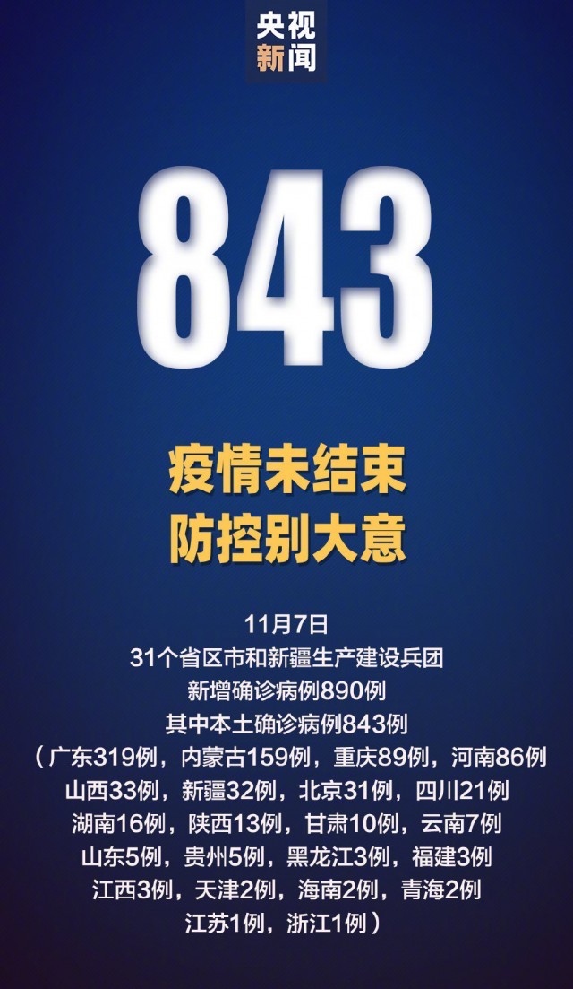 11月7日0—24時(shí),31個(gè)省(自治區(qū)、直轄市)和新疆生產(chǎn)建設(shè)兵團(tuán)報(bào)告新增確診病例890例。其中境外輸入病例47例(福建12例,廣東12例,四川8例,北京5例,天津3例,上海3例,遼寧2例,江蘇1例,山東1例),含2例由無癥狀感染者轉(zhuǎn)為確診病例(廣東1例,四川1例);本土病例843例(廣東319例,內(nèi)蒙古159例,重慶89例,河南86例,山西33例,新疆32例,北京31例,四川21例,湖南16例,陜西13例,甘肅10例,云南7例,山東5例,貴州5例,黑龍江3例,福建3例,江西3例,天津2例,海南2例,青海2例,江蘇1例,浙江1例),含152例由無癥狀感染者轉(zhuǎn)為確診病例(廣東121例,甘肅9例,四川7例,北京3例,重慶3例,福建2例,湖南2例,陜西2例,山西1例,黑龍江1例,浙江1例)。無新增死亡病例。無新增疑似病例。