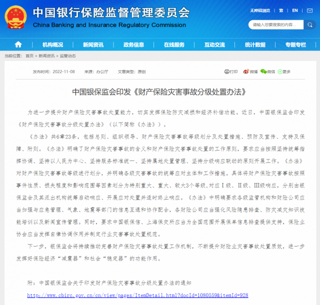 銀保監(jiān)會網(wǎng)站11月8日消息,為進(jìn)一步提升財(cái)產(chǎn)保險災(zāi)害事故處置能力,切實(shí)發(fā)揮保險防災(zāi)減損和經(jīng)濟(jì)補(bǔ)償功能。近日,中國銀保監(jiān)會印發(fā)《財(cái)產(chǎn)保險災(zāi)害事故分級處置辦法》(以下簡稱《辦法》)。