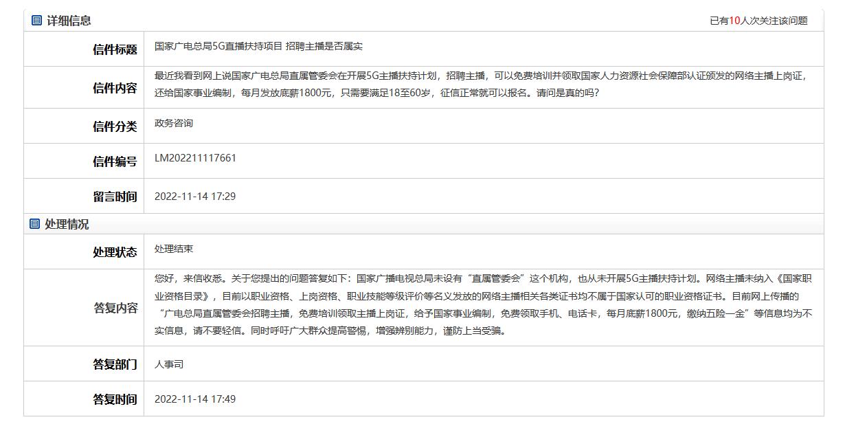 中新網(wǎng)11月14日電 針對(duì)網(wǎng)上流傳“國(guó)家廣電總局直屬管委會(huì)在開(kāi)展5G主播扶持計(jì)劃并招聘主播,可以免費(fèi)培訓(xùn)并領(lǐng)取國(guó)家人力資源社會(huì)保障部認(rèn)證頒發(fā)的網(wǎng)絡(luò)主播上崗證,還給國(guó)家事業(yè)編制,每月發(fā)放底薪1800元”,國(guó)家廣電總局人事司14日回應(yīng)稱,“國(guó)家廣播電視總局未設(shè)有‘直屬管委會(huì)’這個(gè)機(jī)構(gòu),也從未開(kāi)展5G主播扶持計(jì)劃?!?/p>