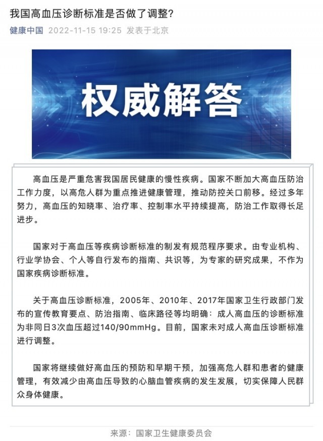 國家衛(wèi)健委:國家未對(duì)成人高血壓診斷標(biāo)準(zhǔn)進(jìn)行調(diào)整