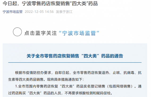 寧波市市場監(jiān)督管理局12月5日在其官方微信公眾號上發(fā)布通告,根據(jù)市疫情防控辦要求,自即日起,全市零售藥店恢復(fù)退熱、止咳、抗病毒、抗生素等四大類藥品銷售?,F(xiàn)將具體措施通告如下: