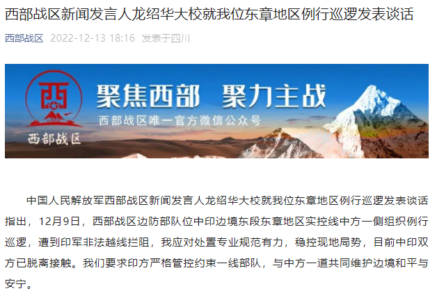 中國人民解放軍西部戰(zhàn)區(qū)新聞發(fā)言人龍紹華大校就我位東章地區(qū)例行巡邏發(fā)表談話指出,12月9日,西部戰(zhàn)區(qū)邊防部隊位中印邊境東段東章地區(qū)實控線中方一側(cè)組織例行巡邏,遭到印軍非法越線攔阻,我應(yīng)對處置專業(yè)規(guī)范有力,穩(wěn)控現(xiàn)地局勢,目前中印雙方已脫離接觸。我們要求印方嚴(yán)格管控約束一線部隊,與中方一道共同維護(hù)邊境和平與安寧。