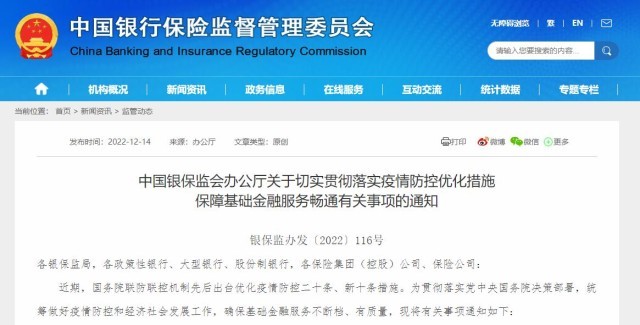 央視網(wǎng)消息:12月13日,中國銀保監(jiān)會辦公廳發(fā)文《關(guān)于切實(shí)貫徹落實(shí)疫情防控優(yōu)化措施 保障基礎(chǔ)金融服務(wù)暢通有關(guān)事項(xiàng)的通知》。