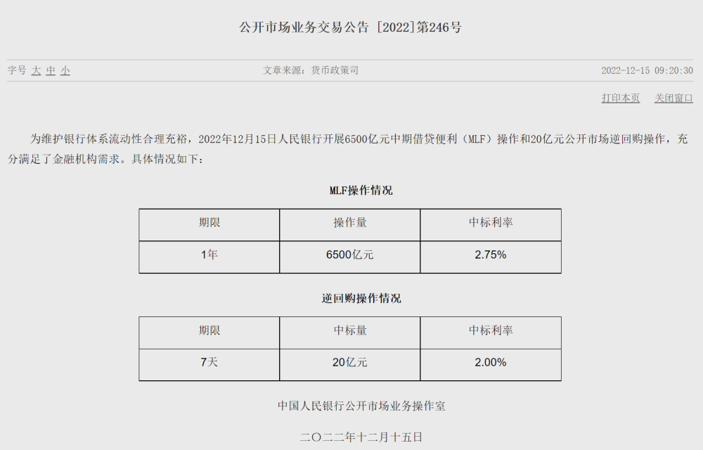 為維護銀行體系流動性合理充裕,12月15日中國人民銀行開展6500億元中期借貸便利(MLF)操作和20億元公開市場逆回購操作,充分滿足了金融機構(gòu)需求,中標利率均與前次持平。