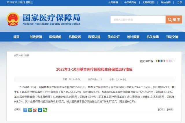 央視網(wǎng)消息:國家醫(yī)療保障局網(wǎng)站12月28日消息,2022年1-10月,全國基本醫(yī)療保險(xiǎn)參保率穩(wěn)定在95%以上。基本醫(yī)療保險(xiǎn)基金(含生育保險(xiǎn))總收入23677.15億元,同比增長6.9%。其中職工基本醫(yī)療保險(xiǎn)基金(含生育保險(xiǎn))收入16251.6億元,同比增長8.8%。城鄉(xiāng)居民基本醫(yī)療保險(xiǎn)基金收入7425.55億元,同比增長3.0%。基本醫(yī)療保險(xiǎn)基金(含生育保險(xiǎn))總支出19187.16億元,同比增長0.9%,職工基本醫(yī)療保險(xiǎn)基金(含生育保險(xiǎn))支出11918.58億元,同比增長1.0%,其中生育保險(xiǎn)待遇支出702.13億元。城鄉(xiāng)居民基本醫(yī)療保險(xiǎn)基金支出7268.57億元,同比增長0.7%。