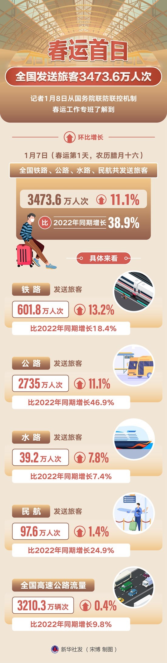 記者1月8日從國務(wù)院聯(lián)防聯(lián)控機(jī)制春運工作專班了解到,1月7日(春運第1天,農(nóng)歷臘月十六)全國鐵路、公路、水路、民航共發(fā)送旅客3473.6萬人次,環(huán)比增長11.1%,比2022年同期增長38.9%。宋博/制圖(新華社發(fā))