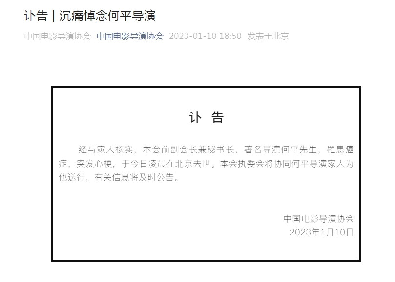 中新網(wǎng)1月10日電 據(jù)中國電影導(dǎo)演協(xié)會消息,經(jīng)與家人核實,中國電影導(dǎo)演協(xié)會前副會長兼秘書長,著名導(dǎo)演何平先生,罹患癌癥,突發(fā)心梗,于1月10日凌晨在北京去世。中國電影導(dǎo)演協(xié)會執(zhí)委會將協(xié)同何平導(dǎo)演家人為他送行,有關(guān)信息將及時公告。