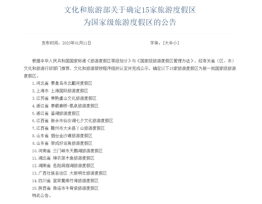 中新網(wǎng)1月11日電 據(jù)文旅部網(wǎng)站顯示,根據(jù)中華人民共和國國家標(biāo)準《旅游度假區(qū)等級劃分》與《國家級旅游度假區(qū)管理辦法》,經(jīng)有關(guān)省(區(qū)、市)文化和旅游行政部門推薦,文化和旅游部按程序組織認定并完成公示,確定以下15家旅游度假區(qū)為新一批國家級旅游度假區(qū):
