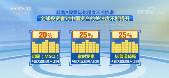 隨著A股國際化程度不斷推進,全球投資者對中國資產(chǎn)的關注度不斷提升。明晟(MSCI)、富時羅素和標普道瓊斯的A股大盤股納入比例已分別達到20%、25%和25%。