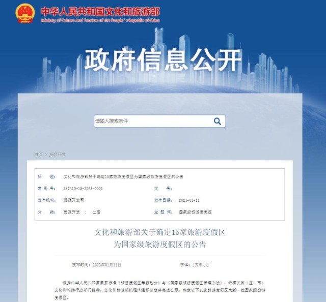 央視網(wǎng)消息:1月11日,文化和旅游部發(fā)布《關于確定15家旅游度假區(qū)為國家級旅游度假區(qū)的公告》。具體內(nèi)容如下: