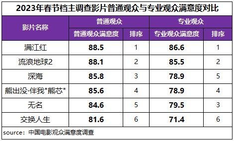 從普通觀眾和專業(yè)觀眾評(píng)價(jià)排序上看,《滿江紅》和《流浪地球2》得到了普通觀眾和專業(yè)觀眾的一致認(rèn)可,前者普通觀眾滿意度得分88.5分、專業(yè)觀眾滿意度得分86.6分,分別居歷史調(diào)查影片的第七位、第六位;后者普通觀眾滿意度得分88.1分、專業(yè)觀眾滿意度得分85.5分,均居歷史調(diào)查影片的第九位。同時(shí),普通觀眾和專業(yè)觀眾對(duì)于《熊出沒 伴我“熊芯”》和《交換人生》評(píng)價(jià)排序也都保持一致,分別列第四位、第六位,此處需要說(shuō)明的是中國(guó)電影觀眾滿意度調(diào)查樣本目前并未覆蓋12歲以下的兒童群體。在評(píng)價(jià)差異上,普通觀眾對(duì)于《深?!贰I(yè)觀眾對(duì)于《無(wú)名》評(píng)價(jià)排序列分別列第三位,反之分別列第五位。