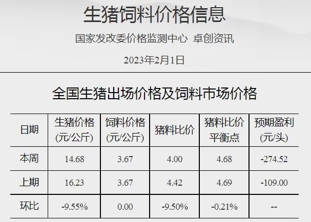 中新網(wǎng)2月6日電 據(jù)國家發(fā)改委價格監(jiān)測中心網(wǎng)站消息,截至2023年2月1日當周,全國豬料比價為4.00,較春節(jié)前(1月18日)下降9.50%。按目前價格及成本推算,未來生豬養(yǎng)殖頭均虧損為274.52元。當周國內(nèi)豬價以降為主。隨著春節(jié)假期收尾,終端消費漸顯疲軟,屠宰企業(yè)開工率低位調(diào)整,整體收購難度不大,壓價情緒較濃,而養(yǎng)殖端雖有抗價情緒,但生豬出欄壓力仍存,周內(nèi)豬價小幅走低。