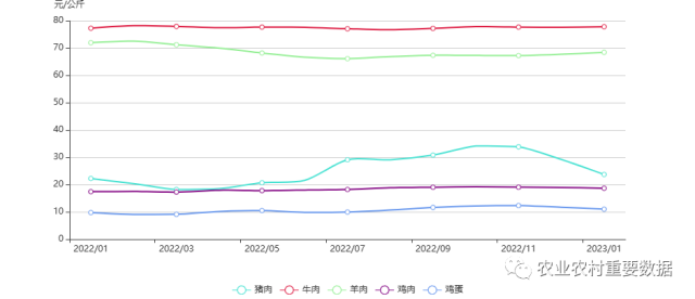 2023年1月,羊肉批發(fā)價(jià)格為68.48元/公斤,比上月上漲1.06%;豬肉、雞肉和雞蛋批發(fā)價(jià)格分別為23.72元/公斤、18.68元/公斤、11.01元/公斤,比上月分別下降18.82%、1.42%、6.14%;牛肉批發(fā)價(jià)格為77.88元/公斤,與上月基本持平。