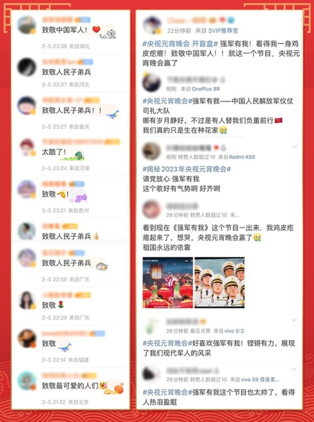 “請黨放心,強(qiáng)軍有我”“清澈的愛,獻(xiàn)給我的祖國”……聲聲誓言、字字鏗鏘。首次參加總臺(tái)元宵晚會(huì)的中國人民解放軍儀仗司禮大隊(duì)奏唱的歌曲《強(qiáng)軍有我》,不僅唱出中國軍人的拳拳赤子心,更唱出了“最可愛的人”那豪邁激情和磅礴氣勢。整齊劃一的動(dòng)作、堅(jiān)定有力的眼神讓無數(shù)網(wǎng)友直呼:“震撼!這就是中國排面”“為人民子弟兵熱淚盈眶”“致敬中國軍人!感謝你們?yōu)榇蠹邑?fù)重前行”。而網(wǎng)友們也用整齊一致的留言共同致敬“最可愛的人”。