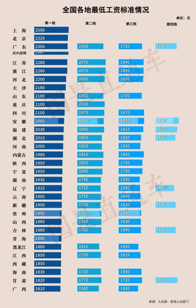 上述四地調整后,全國已有15個省份最低工資標準加入“2000元俱樂部”。其中上海最高,為2590元。緊隨其后的是:北京(2320元)、廣東(2300元,其中深圳2360元)。