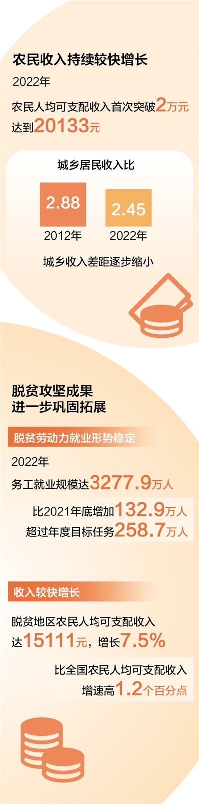增加農(nóng)民收入是“三農(nóng)”工作的中心任務(wù)。2022年,農(nóng)民人均可支配收入首次突破2萬元,城鄉(xiāng)居民收入比從2012年的2.88下降到2022年的2.45,城鄉(xiāng)收入差距逐步縮小?!耙惨吹?,當(dāng)前農(nóng)民收入增速有所放緩,增收動能有所減弱。必須高度重視,拿出長短結(jié)合、務(wù)實(shí)管用的硬措施,拓寬農(nóng)民增收致富渠道。”中央農(nóng)辦專職副主任、農(nóng)業(yè)農(nóng)村部黨組成員吳宏耀說。對此,今年中央一號文件在穩(wěn)定就業(yè)、經(jīng)營增效、挖潛財產(chǎn)收入以及拓展轉(zhuǎn)移收入等方面作出相關(guān)部署,努力讓農(nóng)民腰包越來越鼓,日子越過越紅火。
