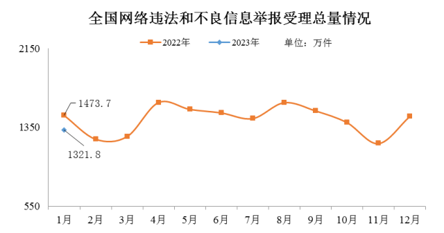 2023年1月全國受理網(wǎng)絡(luò)違法和不良信息舉報1321.8萬件