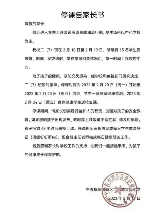 近日,杭州、寧波、金華、天津等地有學(xué)校發(fā)出通知部分學(xué)生出現(xiàn)發(fā)燒等癥狀停課、提前放學(xué)。