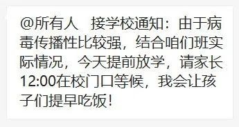 今天(2月20日)早上,一張截圖在部分金華市民朋友圈中傳播。金華一學(xué)校發(fā)布了提前放學(xué)通知:“由于病毒傳播性比較強(qiáng),結(jié)合咱們班實(shí)際情況,今天提前放學(xué),請家長12:00在校門口等候。”