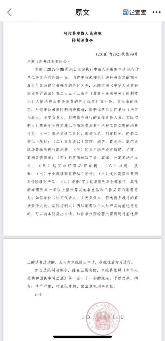 據(jù)了解,內(nèi)蒙古新井煤業(yè)有限公司于1999年登記成立,企查查平臺(tái)顯示,該公司多次涉及買(mǎi)賣(mài)合同糾紛、租賃合同糾紛、借款合同糾紛等,后被法院列為失信被執(zhí)行人,公司法定代表人也曾多次被法院限制高消費(fèi)。