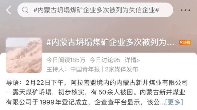 2月22日,內(nèi)蒙古阿拉善盟阿拉善左旗新井煤業(yè)有限公司一露天煤礦發(fā)生大面積坍塌,有工作人員和車(chē)輛被埋。