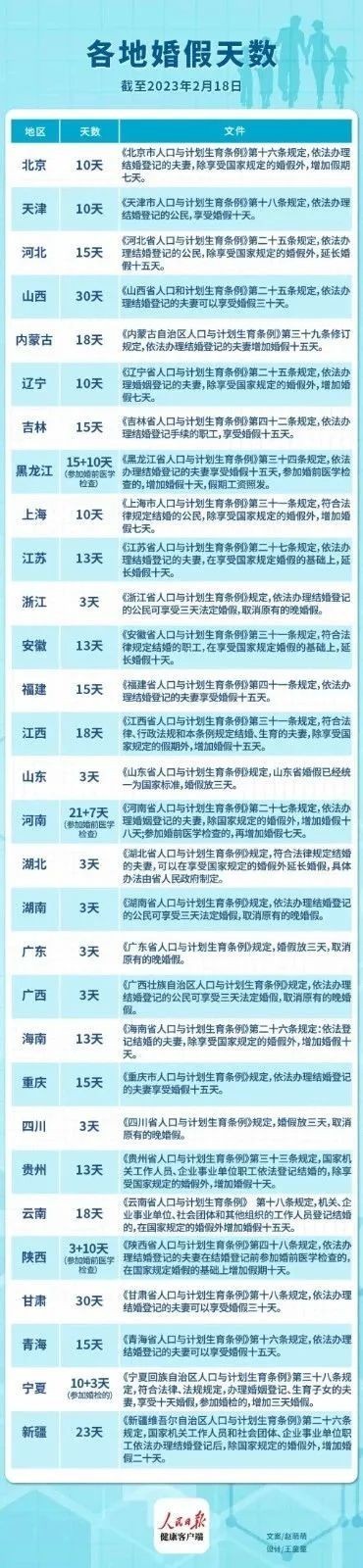 在一份全國各地婚假天數(shù)表中,具體的婚假天數(shù),各省的差距頗大。其中,浙江等省份只有3天。