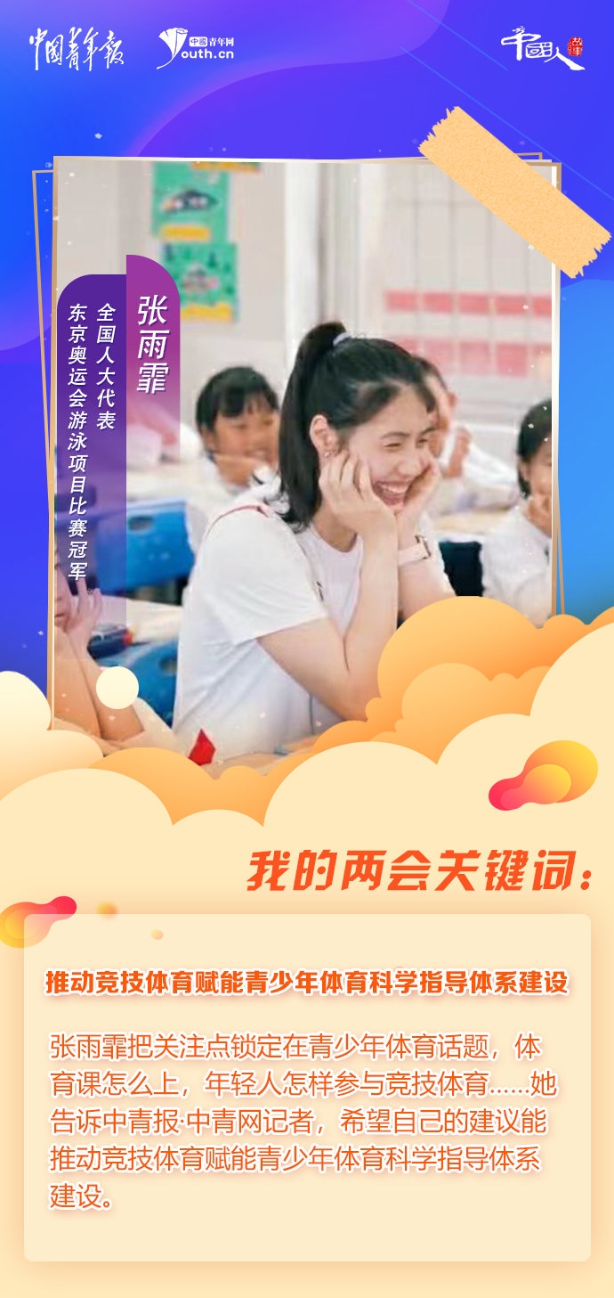生于1998年的張雨霏在東京奧運(yùn)會(huì)游泳項(xiàng)目比賽中斬獲兩金兩銀,是新當(dāng)選的全國(guó)人大代表。最近幾天,25歲的她正忙著完善自己的建議。