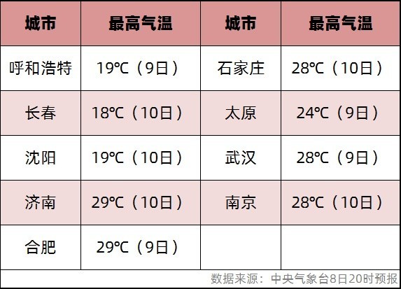 多地最高氣溫還將繼續(xù)突破紀(jì)錄。大城市中,呼和浩特、長(zhǎng)春、沈陽(yáng)、濟(jì)南、合肥氣溫都可能刷新當(dāng)?shù)?月上旬最高紀(jì)錄,石家莊、太原、武漢、南京等地也會(huì)經(jīng)歷同期少見的暖。