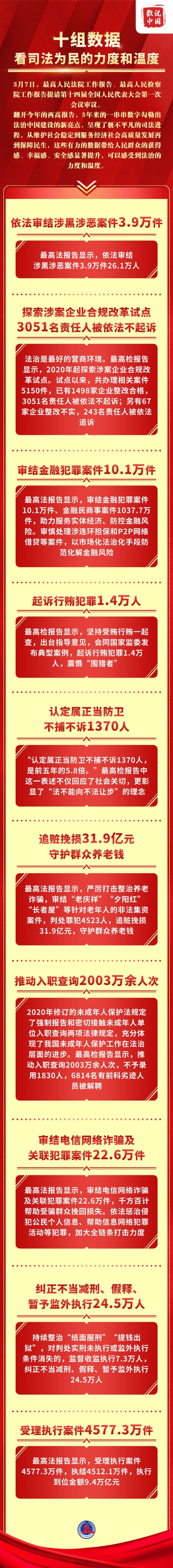 翻開今年的兩高報(bào)告,5年來的一串串?dāng)?shù)字勾勒出法治中國(guó)建設(shè)的新亮點(diǎn),呈現(xiàn)了極不平凡的司法進(jìn)程,從維護(hù)社會(huì)穩(wěn)定到服務(wù)經(jīng)濟(jì)社會(huì)高質(zhì)量發(fā)展再到保障民生,這些有力的數(shù)據(jù)帶給人民群眾的獲得感、幸福感、安全感顯著提升,可以感受到法治的力度和溫度。