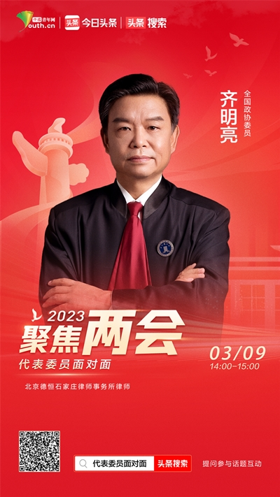 中國(guó)青年網(wǎng)北京3月9日電(記者 薛艷麗)3月9日,全國(guó)政協(xié)委員,河北省律師協(xié)會(huì)副會(huì)長(zhǎng),北京德恒(石家莊)律師事務(wù)所律師齊明亮做客中國(guó)青年網(wǎng)聯(lián)合今日頭條舉辦的線上“2023代表委員面對(duì)面”微訪談活動(dòng),和大家分享今年全國(guó)兩會(huì)期間自己帶來(lái)的提案。