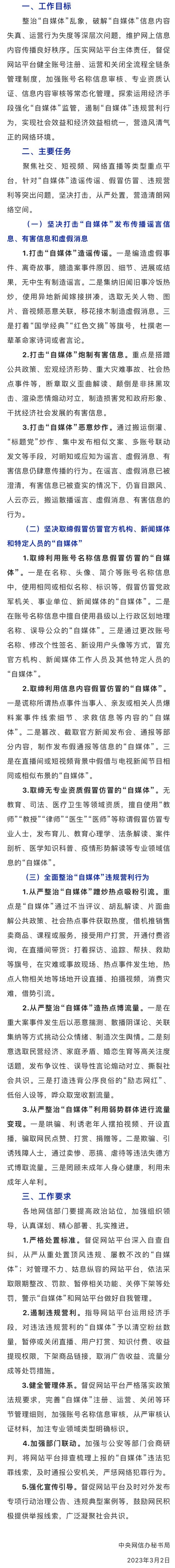 近日,中央網(wǎng)信辦印發(fā)通知,自即日起,開展為期兩個月的“清朗·從嚴整治‘自媒體’亂象”專項行動。具體內(nèi)容如下: