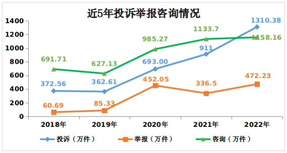 消費(fèi)者積極發(fā)揮社會監(jiān)督作用,2022年全年向市場監(jiān)管部門舉報(bào)各類違法線索472.23萬件,同比增長40.34%。