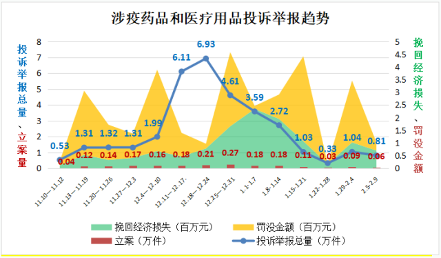 “二十條”和“新十條”出臺后,疫情防控重心從防控感染轉(zhuǎn)到醫(yī)療救治,2022年11月10日至2022年底,全國12315平臺接收相關(guān)投訴舉報(bào)24.11萬件,同比增長3.88倍,環(huán)比增長2.95倍,最高峰值達(dá)到19.5倍。其中,投訴14.18萬件,舉報(bào)9.93萬件,挽回經(jīng)濟(jì)損失498.17萬元。
