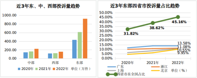 從近三年趨勢看,廣東、浙江、上海、北京4個省市的消費(fèi)正在加速集聚。消費(fèi)投訴數(shù)量與消費(fèi)活躍水平呈正相關(guān)關(guān)系,四省市消費(fèi)投訴數(shù)量在全國的占比從2020年的31.8%增長到2022年的45.16%。
